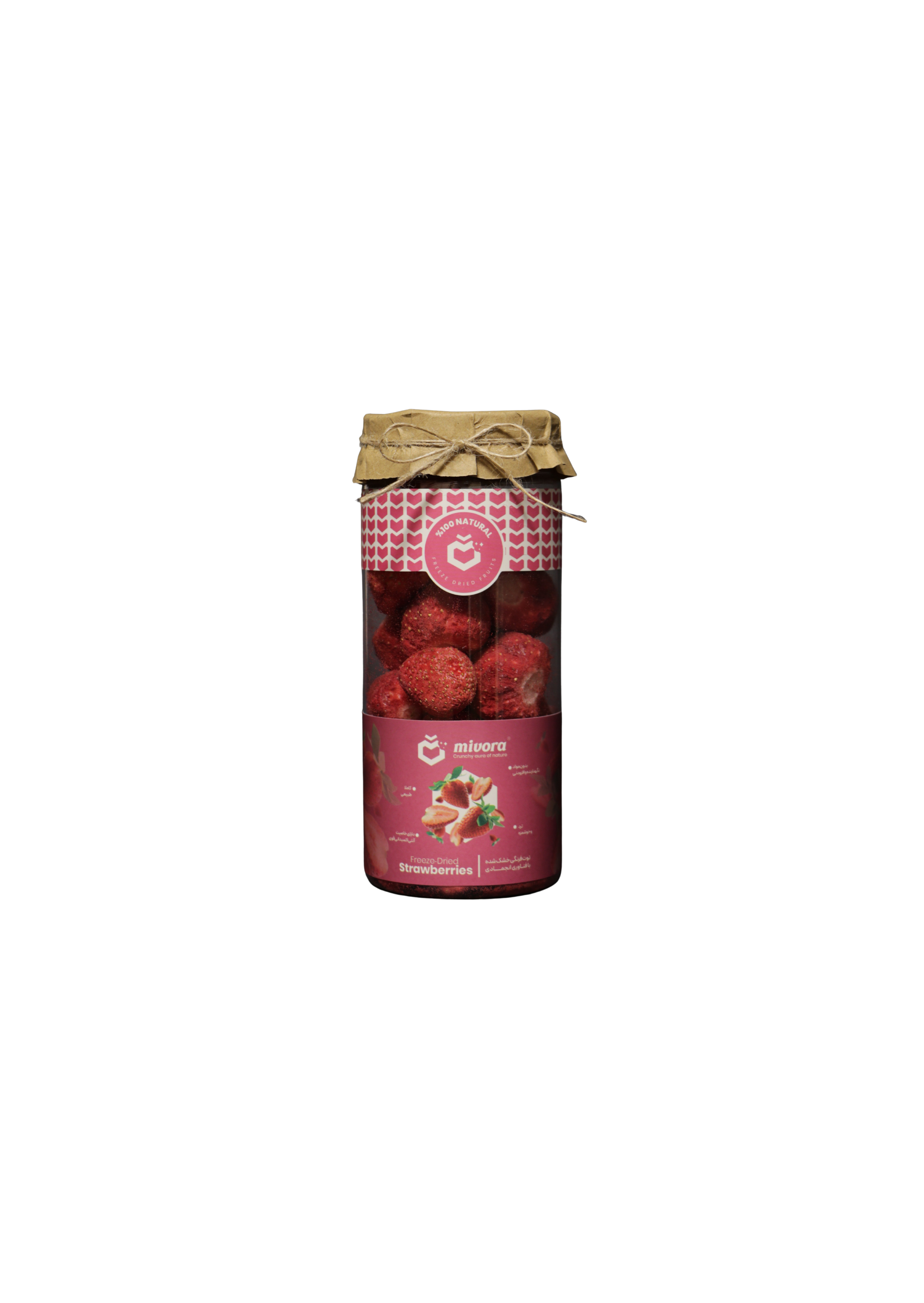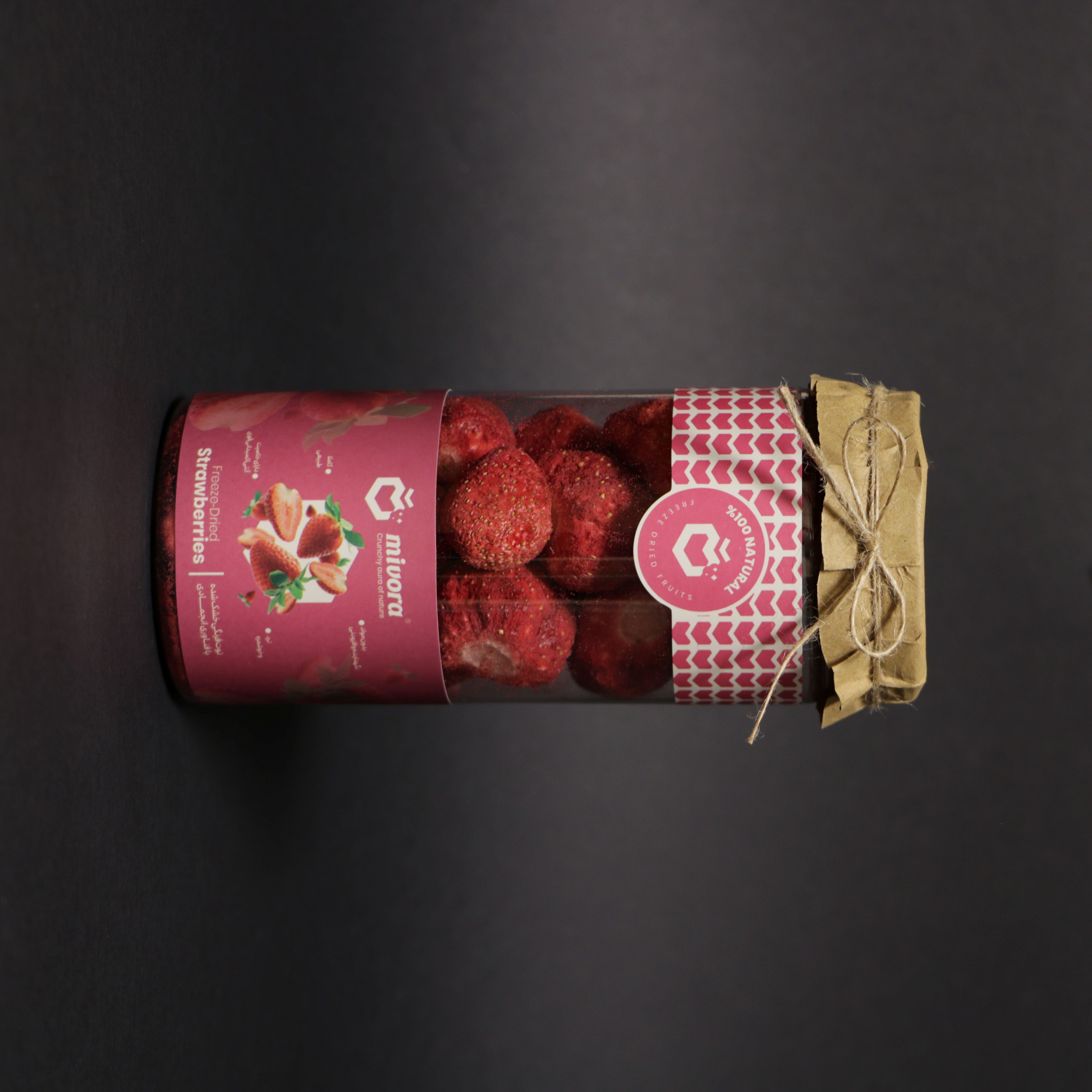 تیم میوُرا با کیفیت ترین توت فرنگی های وارداتی و برداشت شده ار باغ ها و گلخانه های ایران را گلچین کرده و با استفاده از تکنولوژی فریز درای (Freeze drying) به میان وعده ای ترد، سبک، سالم و با ماندگاری بالا تبدیل کرده است. در نهایت پس از جداسازی وکنترل کیفیت ثانویه، توت فرنگی های فریز درای خود را در سه سایز کوچک، متوسط و بزرگ ارائه میکند.